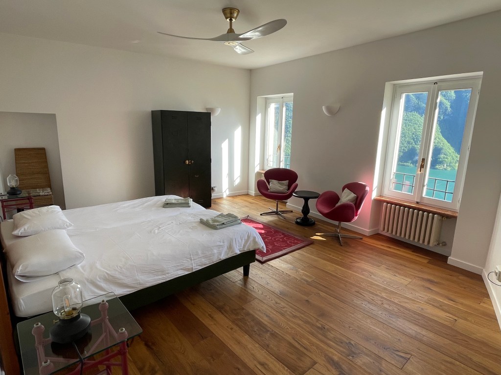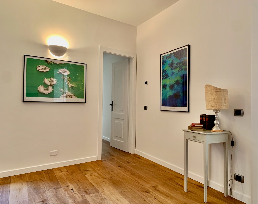 This entirely renovated floor combines charm and luxury with high quality French oak parquet, two bedrooms ranging in size from 17 to 23 square meters and a bathroom with floor heating. The staircase leading from the ground floor opens onto a large cinema room. With its comfortable sofa, striking art works and beamer, it is the perfect spot for a cosy movie night.