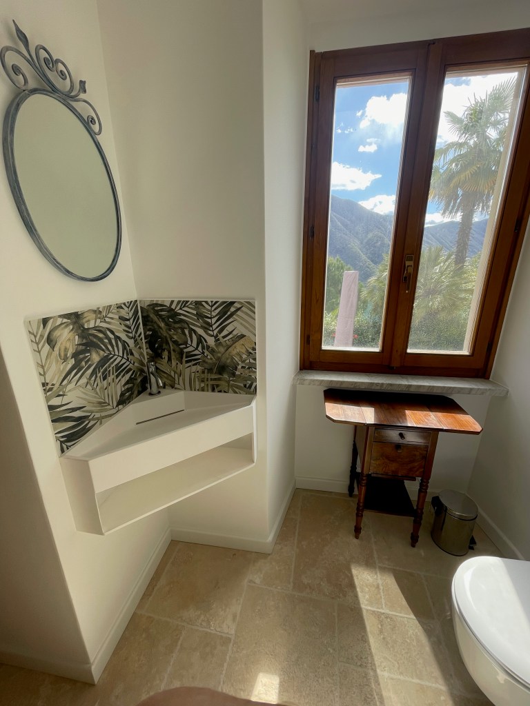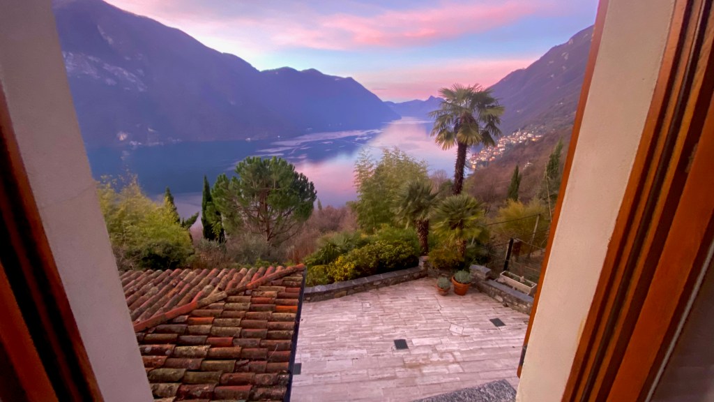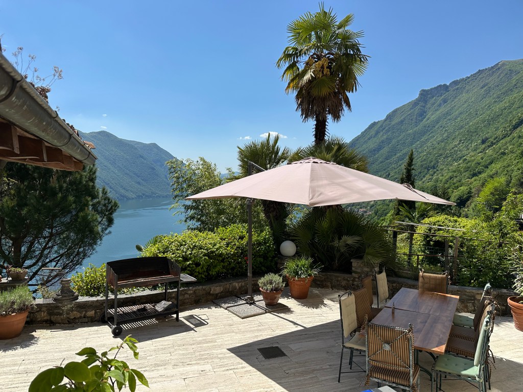 The inside space on this floor contains a fully-equiped kitchen, laundry facilities, a double bedroom and a bathroom with shower and floor heating. This lower part of the villa opens directly onto an 85 square meter terrace with amazing views of Lake Lugano. The south-facing terrace is equipped with a BBQ, garden tables with chairs, a large umbrella and sun loungers. A covered patio provides a shady spot for relaxing lunches and diners. The terrace is the ideal location for sunbathing and relaxing with friends; surrounded by flowers, palm trees and the magical charms of Lake Lugano and Monte Salvatore.